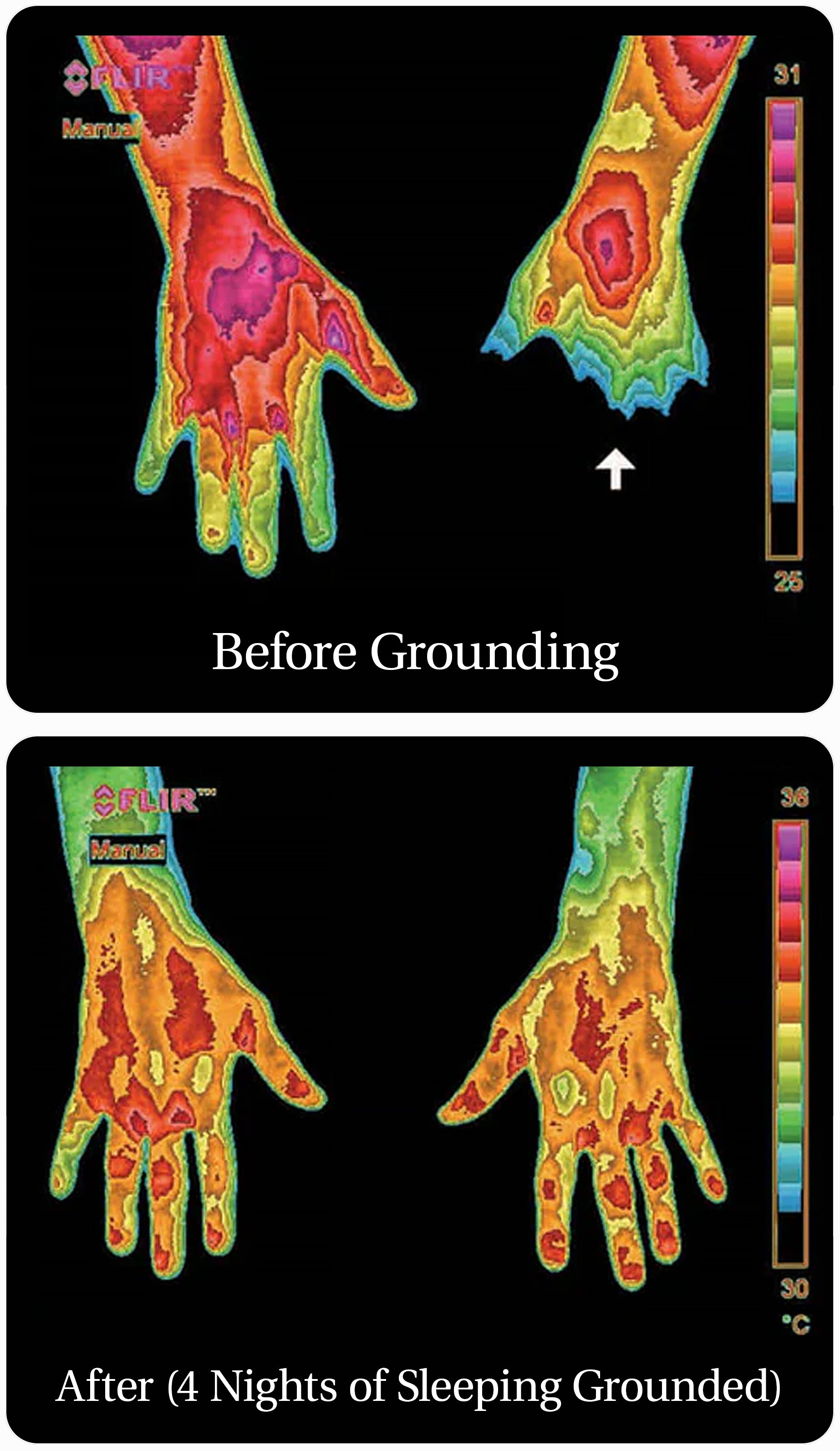 The 'Before' image shows baseline thermal scans of hands and arms with poor circulation highlighted by arrows, where the temperature in the left hand is as low as the room, causing the fingers to disappear (termed thermal amputation). The 'After' image, taken after four nights using the Grounding Sleep System, shows a notable improvement in circulation and restored thermal symmetry in both arms. Initially, the fingers of the left hand were at about 25 degrees Celsius, increasing to about 34 degrees Celsius post-grounding.